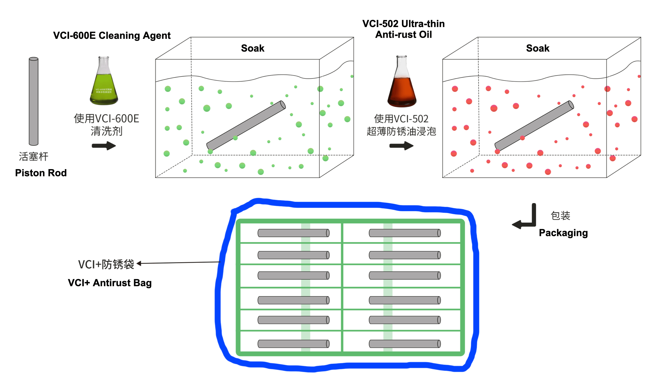 3. Verwenden Sie das ultradünne Rostschutzöl VCI-502, um Rost auf der Oberfläche der Kolbenstange zu verhindern, die Trocknungszeit der Oberfläche zu verkürzen und die Effizienz zu verbessern